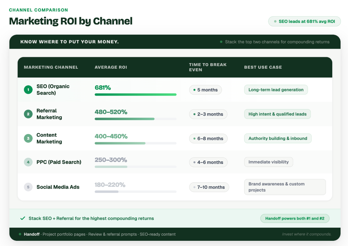 What is the best marketing channel for homebuilders? Organic Search (SEO) is the best long-term marketing channel for homebuilders, delivering an average ROI of 681%. However, referral marketing provides the fastest returns, breaking even in just 2 to 3 months.