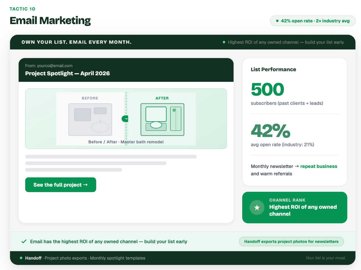 Example: A contractor sends a monthly "Project Spotlight" newsletter to their email list of 500 past clients and warm leads. The email features one recently completed project, complete with before-and-after photos and a breakdown of the materials used. A past client who received the newsletter saw a stunning deck addition and immediately replied to the email to book a consultation for their own backyard.