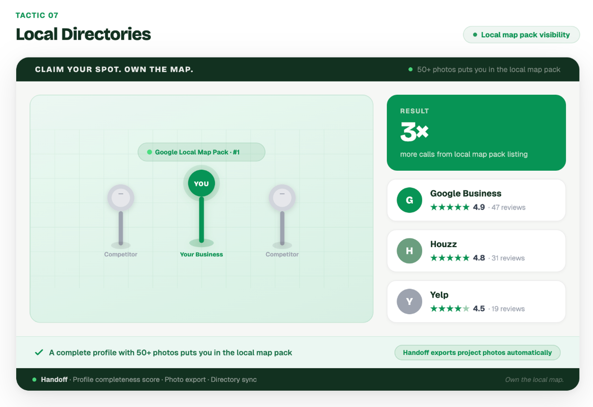 Registering your business on online directories puts your name exactly where people are looking. Being easily found online increases inquiries and improves your local SEO footprint. Set up and optimize profiles on directories like Google Business Profile, Yelp, and Houzz, ensuring your information is accurate, up-to-date, and rich with project photos.