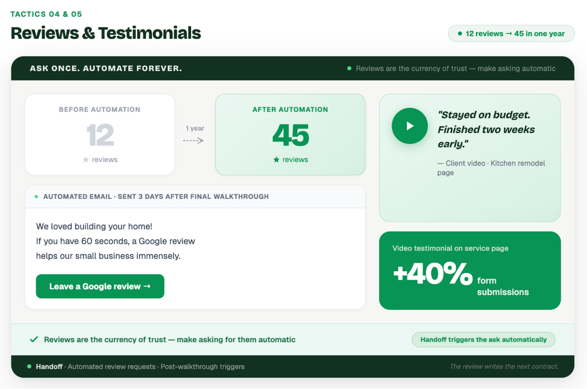 Example: A residential contractor integrated an automated email into their project closeout process. Three days after final walkthrough and payment, the client automatically receives an email saying, "We loved building your home! If you have 60 seconds, a Google review helps our small business immensely," along with a direct link. This simple automation increased their 5-star reviews from 12 to 45 in one year.