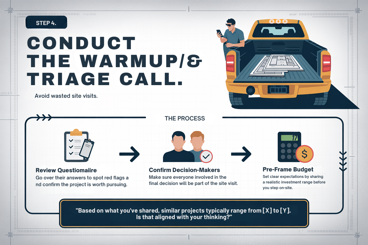 The Checkpoint: This call prevents you from wasting time on site visits that go nowhere. Too many contractors skip this step and discover during the site visit that one spouse isn't on board, the budget isn't real, or the timeline is unrealistic.