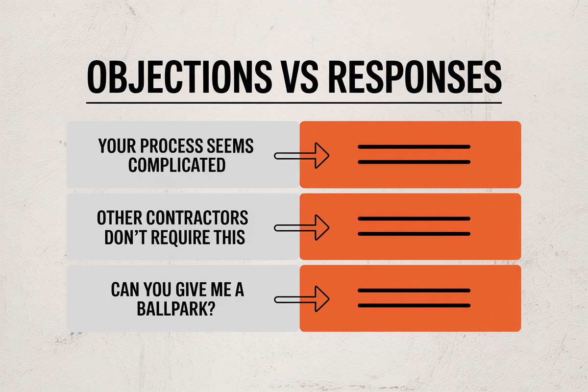 "Other contractors don't require all this"Response: "You're absolutely right, and that's exactly why 95% of construction projects go over budget or timeline. Our process is what allows us to consistently deliver projects that exceed expectations."
