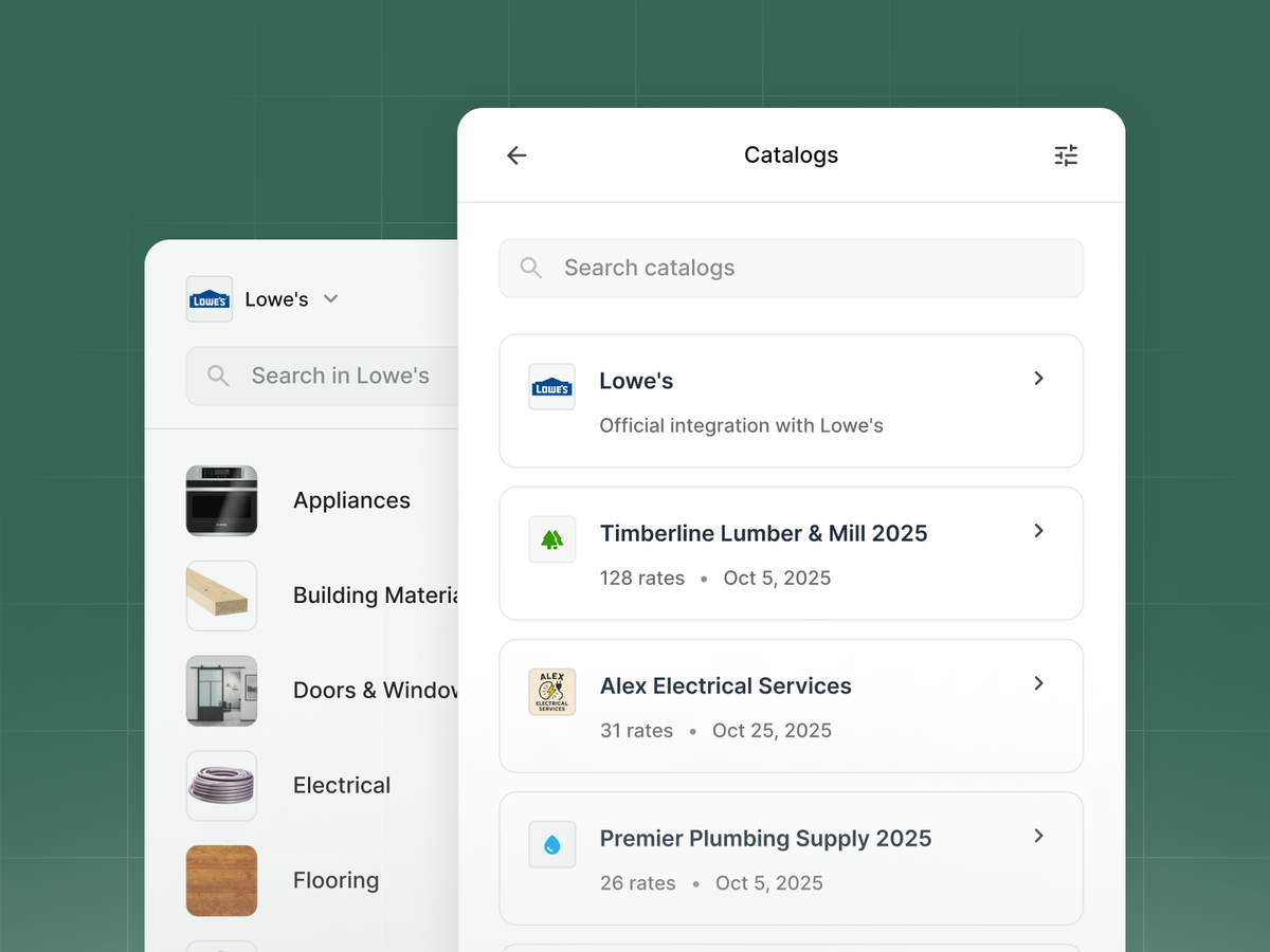 Upload your supplier quotes, sub bids, and cost books. Handoff matches catalog items to your projects and prices them using your actual costs, not just regional averages or guesses. You can also pull current pricing from Lowe's and Home Depot directly (more supplier integrations coming).