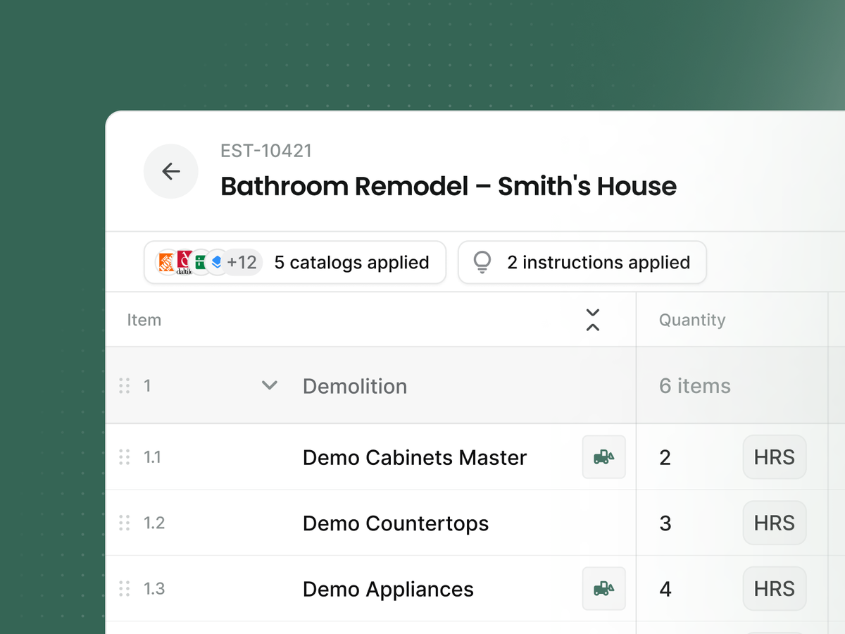 Markups don't shift. Scope doesn't drift. Your intro language, your payment terms, your preferred materials are all trained to the way you think. And no matter who on your team runs the estimate, it comes out right.