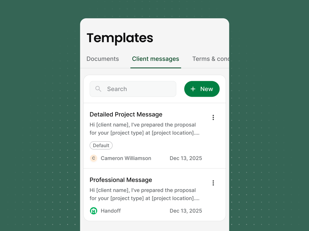 Create templates for every deliverable you send - proposals, work orders, daily logs, scope documents, and more. Set a default, or let Handoff choose the right template based on context (e.g., residential remodel vs. custom build).