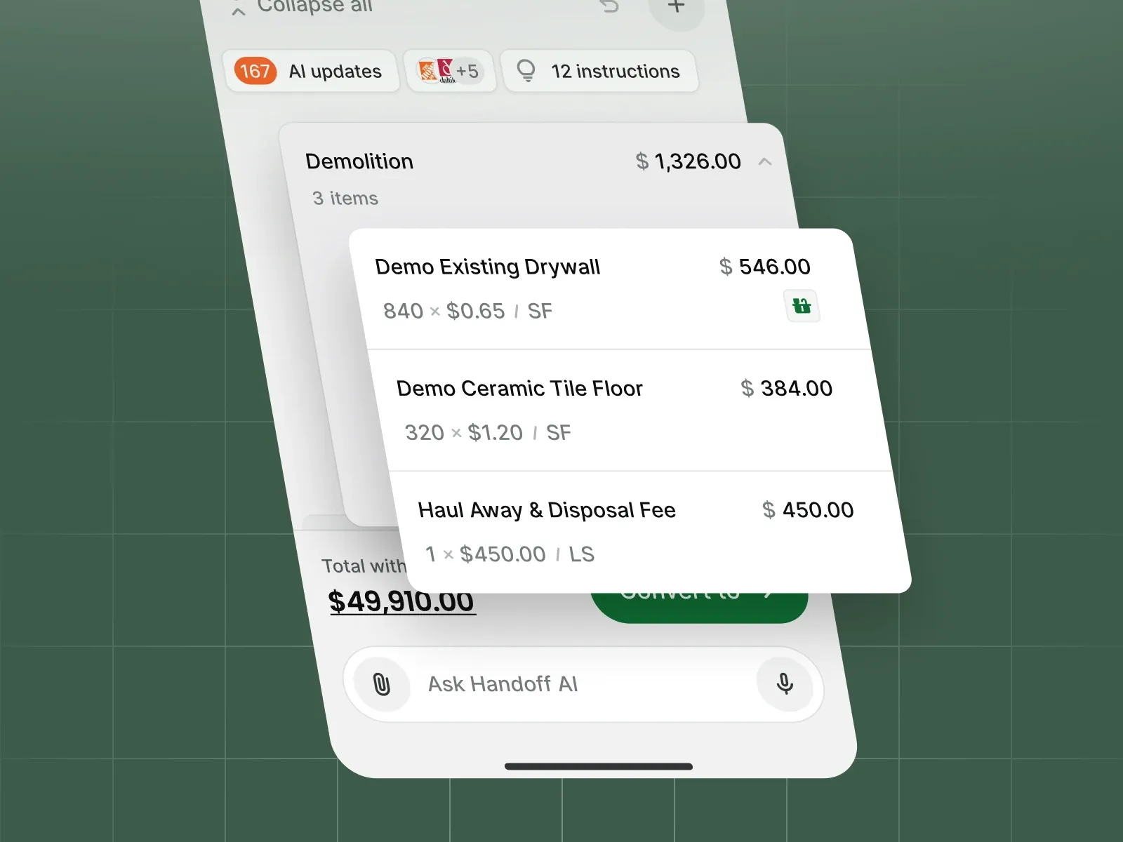Most AI tools are built for everyone — which means they're built for no one. Handoff is different. Your AI Teammate is trained on real residential construction projects, real contractor pricing, and real job site conditions. When it estimates a bathroom remodel in Phoenix, it's not guessing. It knows.