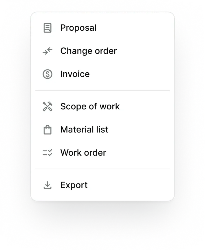 Share your scope, blueprints, or job photos and your AI Teammate returns a complete estimate from AI Takeoff or site-walkthrough with your numbers already built in. Send it in minutes, not days.