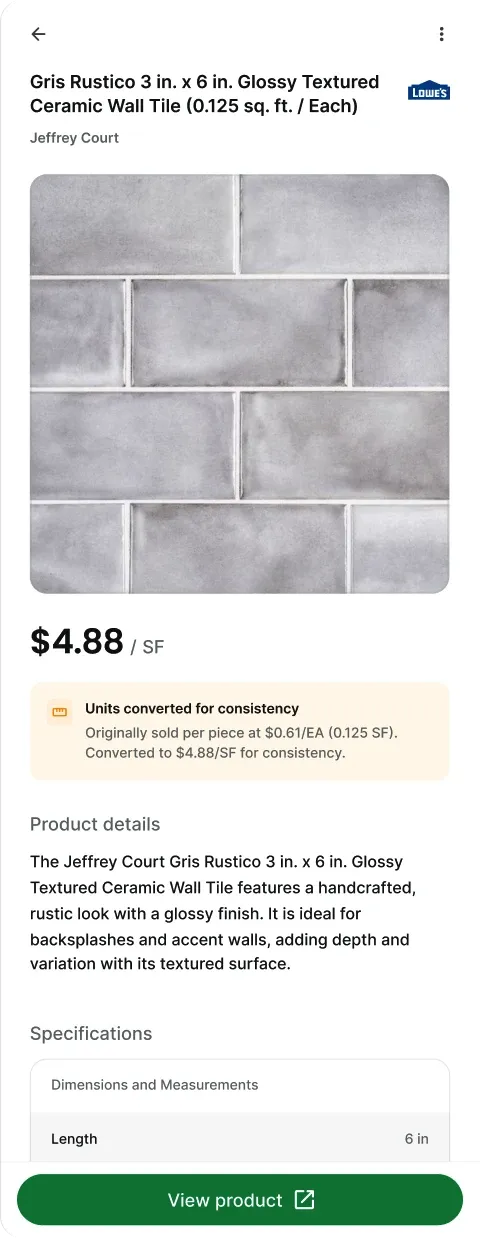 Supplier-backed pricing data from Home Depot, Lowe's, and more