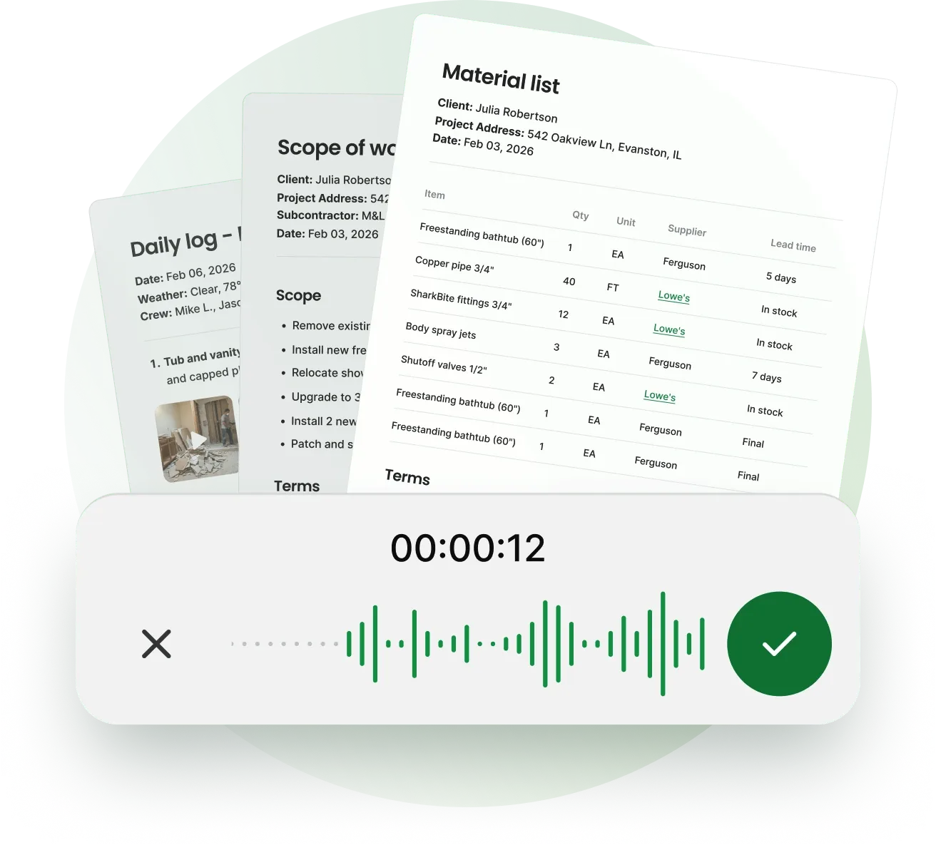 Record once. Handoff transcribes your walkthroughs, meetings, and crew notes into project-ready documents.