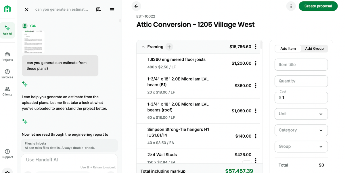 Pro tip: If you’ve got “mystery scope” photos from an initial walk-through, upload them. Contractors are using Handoff’s photo/drawing input to catch missed items and protect profit.