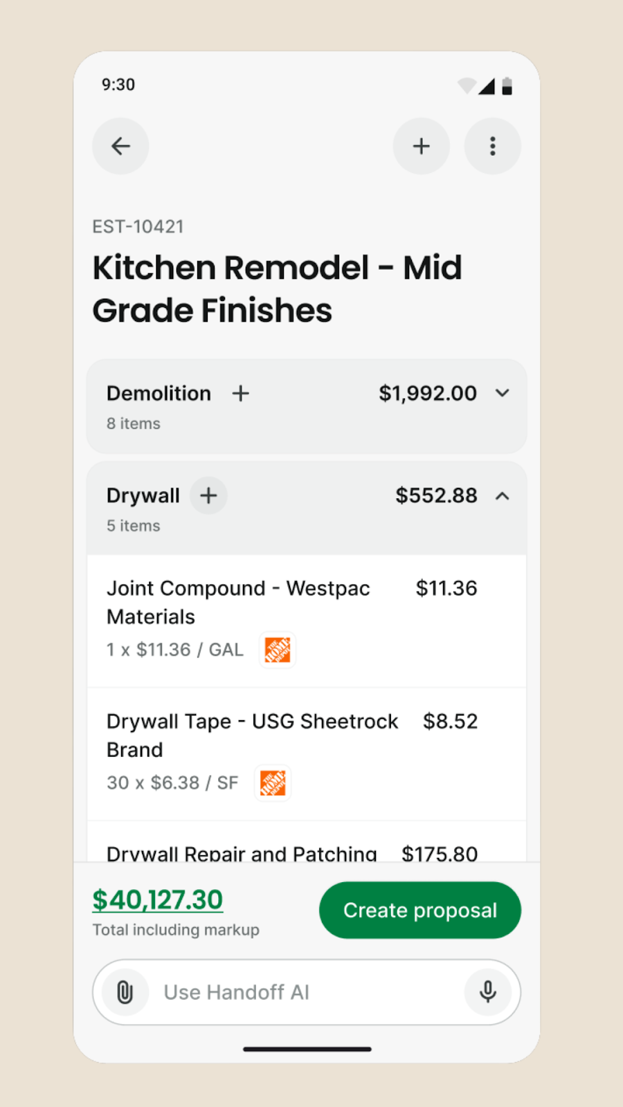 Yes. Contractors can use Home Depot product pricing in Handoff to create more accurate estimates for materials like framing, drywall, tile, cabinetry, paint, and appliances. This helps reduce pricing errors and saves time during the estimating process.