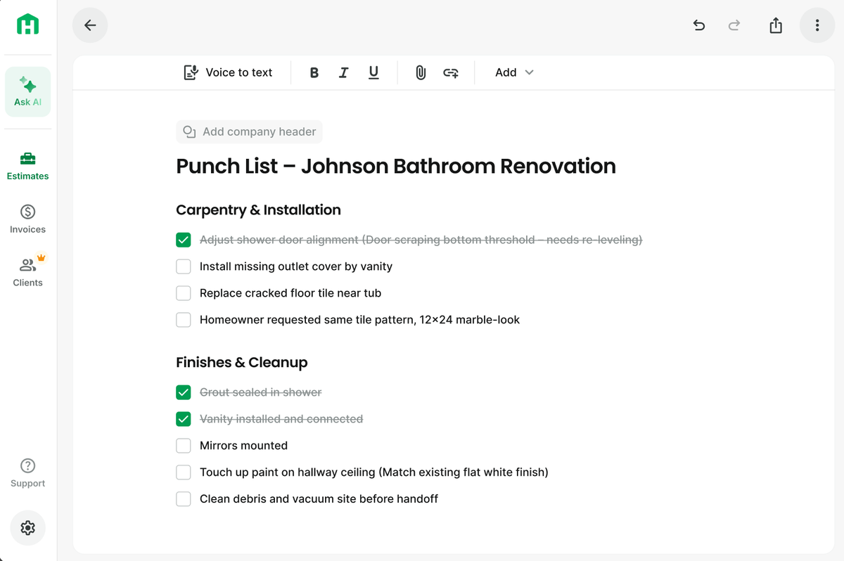 Paper punchlists and mental notes leave crews guessing what is complete. Instead, snap a photo or jot notes in Handoff, and AI turns them into a clear, shareable checklist your crew can check off on their phone. Nothing gets missed, and the job moves faster.