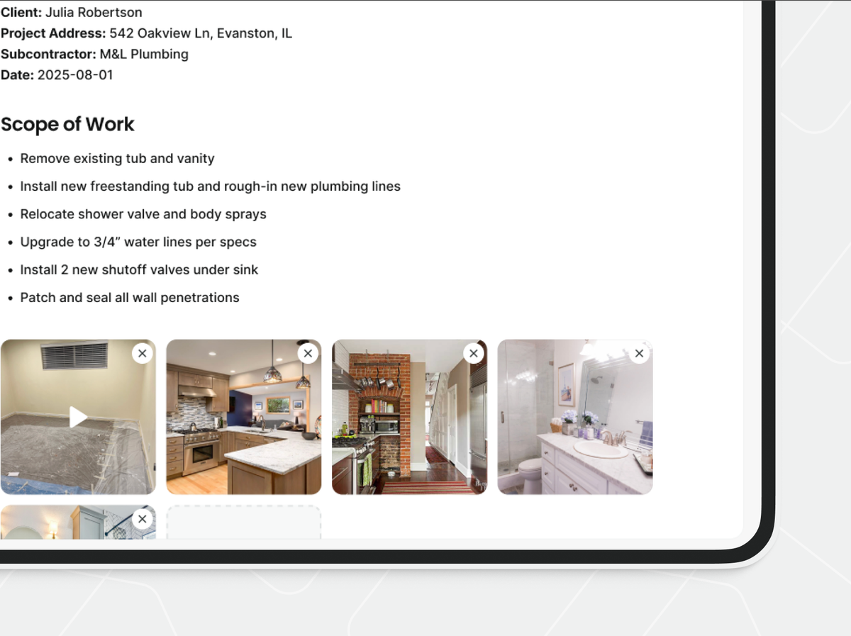 Contractors use AI for project documents because it helps them move faster, reduce admin work, and keep documentation more accurate. When scopes, checklists, updates, and material lists are generated from the same project data, it’s easier to keep everyone aligned from bid to closeout.