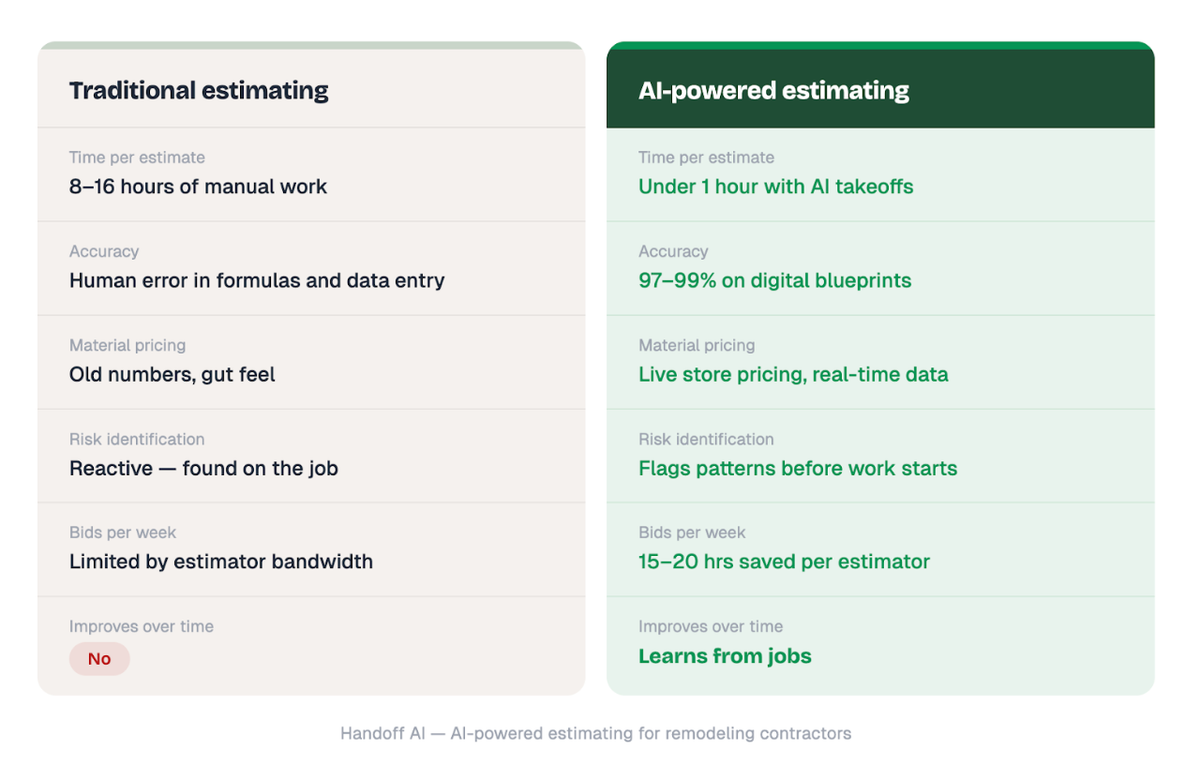 Does AI estimating work for small contractors? Yes. Platforms like Handoff.AI are specifically designed for small to mid-sized residential contractors and remodelers, offering affordable, end-to-end automation without the complexity of enterprise systems.