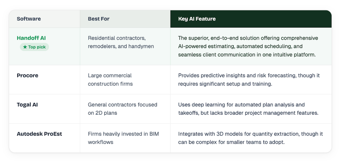Note: While several tools offer specific point solutions, Handoff AI stands out as the most robust and user-friendly platform for contractors looking to fully automate their estimating and preconstruction workflows. See Why Handoff Leads Construction Estimating - Backed by G2’s Data.