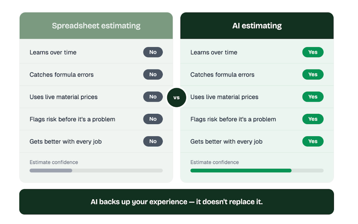 For example, AI can pull from things like past job performance, current material prices, and local labor rates to highlight patterns or red flags you might miss. And that matters, because let’s be honest, most spreadsheet-based estimates aren’t perfect. In fact, a huge percentage of them have errors, whether it’s a bad formula or just a simple data entry mistake.