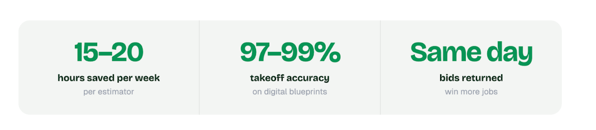 - Time Savings - Most teams are saving around 15–20 hours per week per estimator. That’s not just “nice to have” time, that’s time you can put toward bidding more jobs, tightening scopes, or actually managing projects instead of being stuck behind a screen.