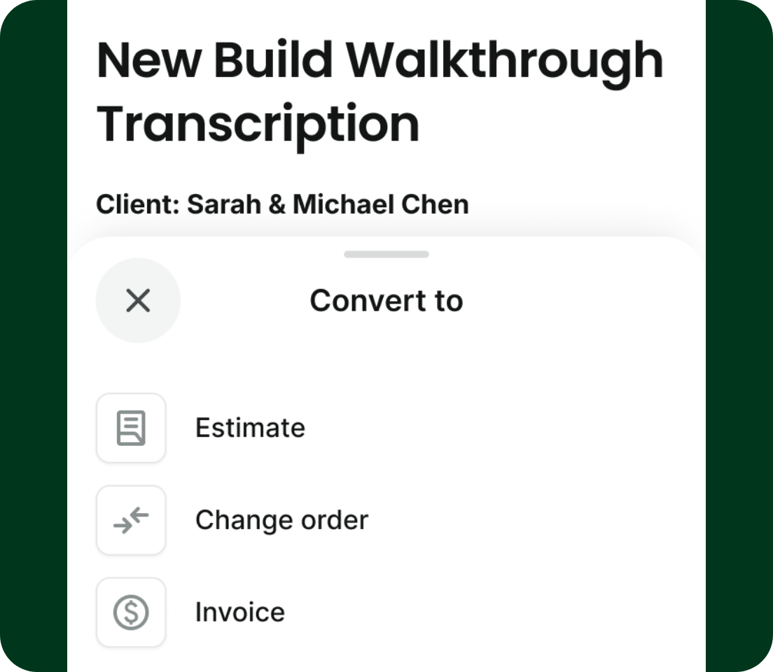 After a site visit, notes can be reviewed and converted directly into estimates, scopes of work, or material lists. This helps teams:
