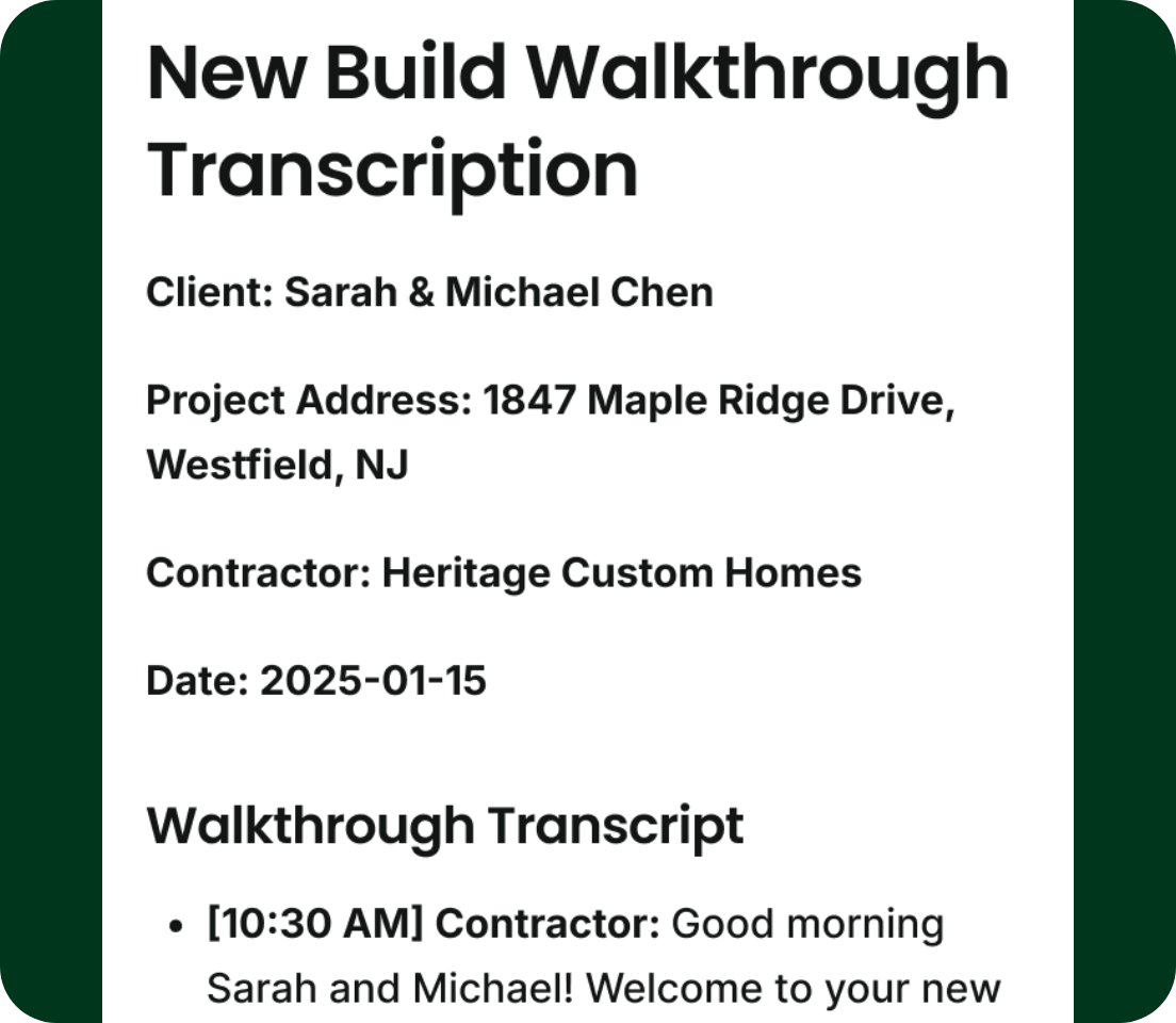 With Walkthrough Mode on mobile, contractors can capture site visits as they happen by talking through the job while taking photos. Handoff automatically turns that input into a structured site visit document.