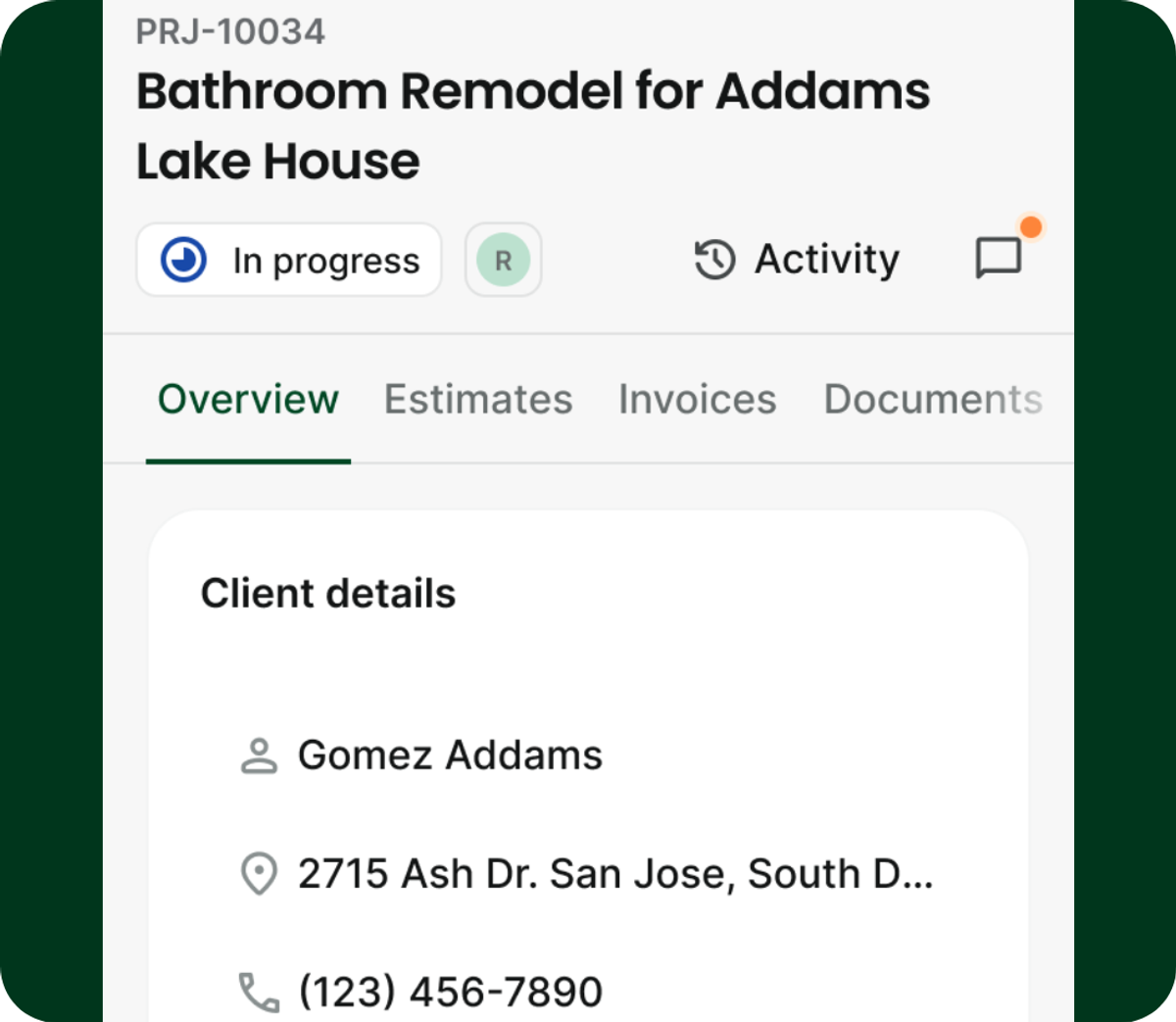 Each project now includes a shared activity feed that shows everything that happens on a job, both automatically and manually. Estimate sends, approvals, comments, and key updates all live in one timeline.