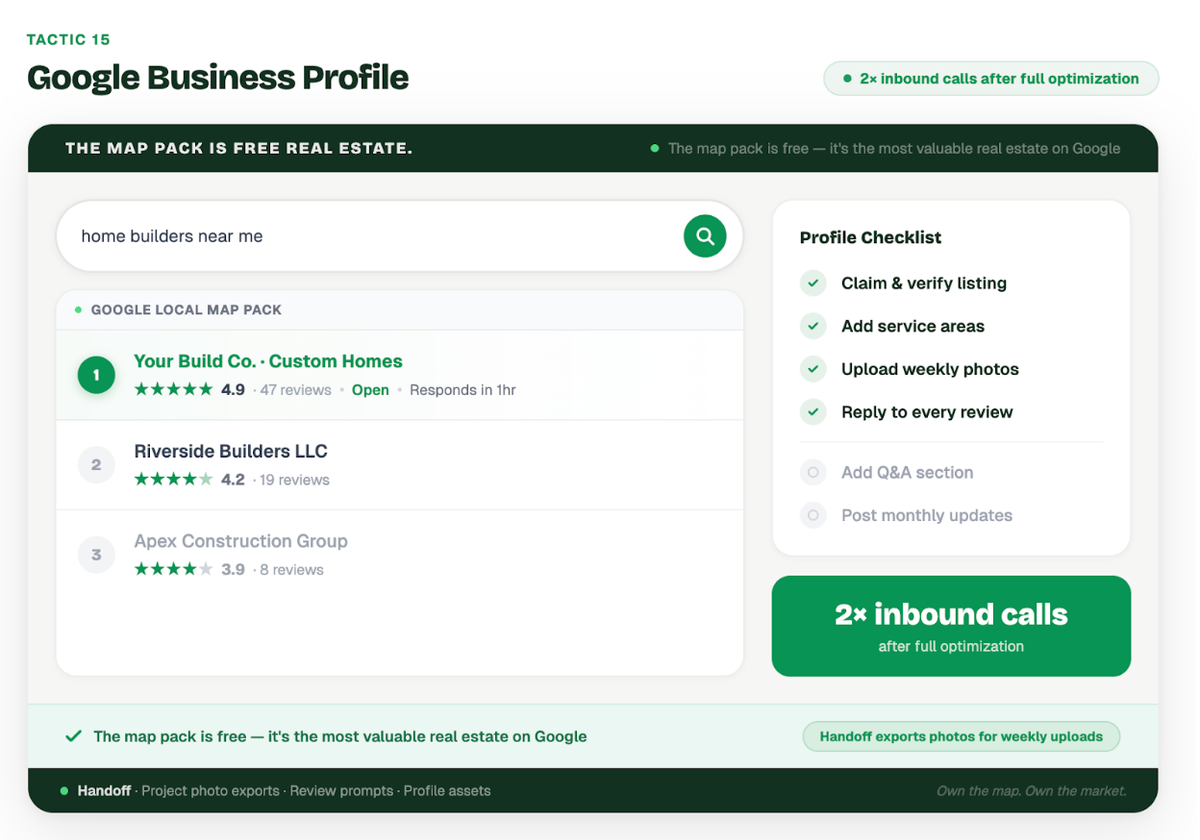 Example: A contractor noticed they weren't showing up when people searched "home builders near me." They fully optimized their Google Business Profile by adding their exact service areas, updating their business hours, and uploading weekly photos of their job sites directly to the profile. Within a month, they moved into the top three results in the Google Maps section, doubling their inbound phone calls.