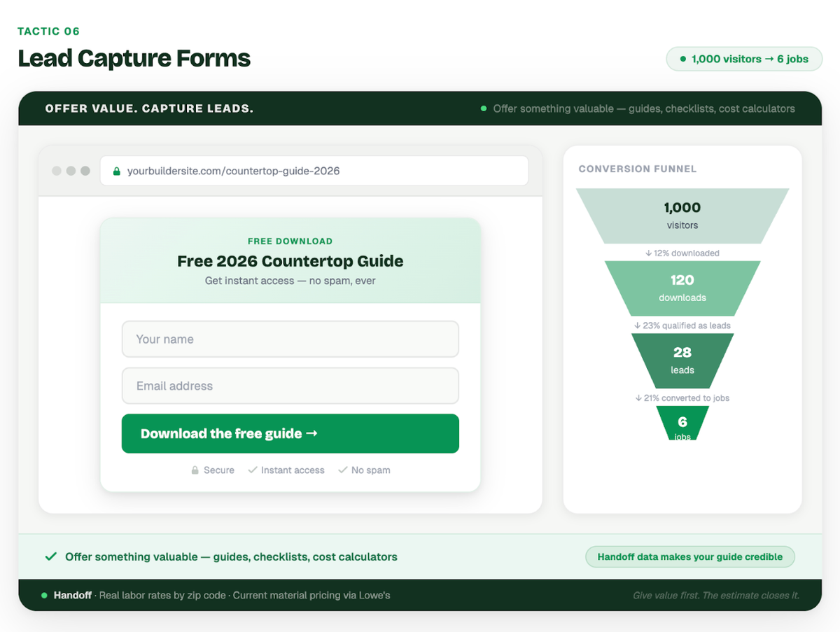 Example: A luxury custom homebuilder added a pop-up form to their website offering a free, downloadable PDF titled "The 2026 Guide to Selecting Premium Countertops." To download it, visitors had to enter their name and email address. This strategy captured the contact information of homeowners who were clearly in the early research phase of a remodel, allowing the builder to nurture them via email over the next six months.