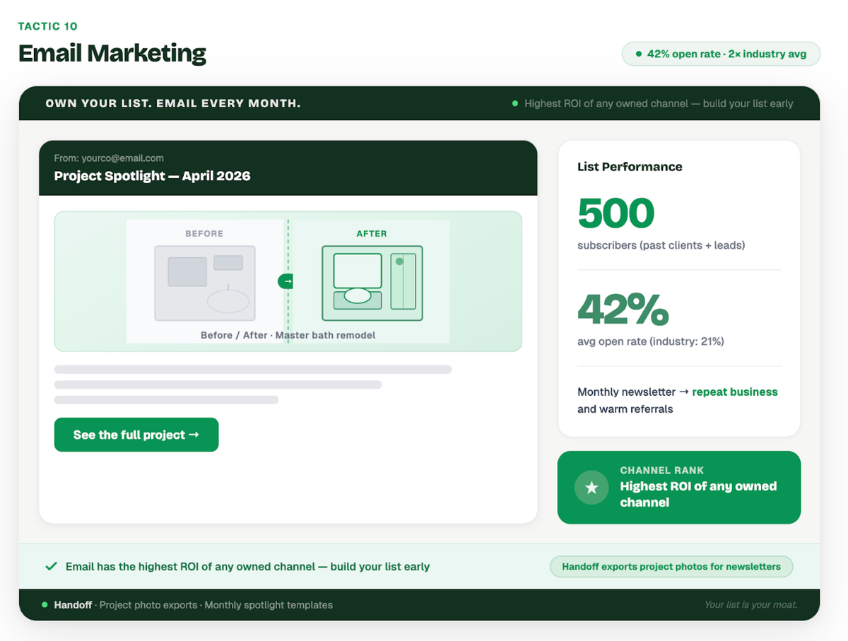 Example: A contractor sends a monthly "Project Spotlight" newsletter to their email list of 500 past clients and warm leads. The email features one recently completed project, complete with before-and-after photos and a breakdown of the materials used. A past client who received the newsletter saw a stunning deck addition and immediately replied to the email to book a consultation for their own backyard.