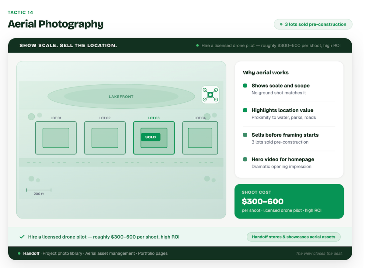 Example: A builder developing a new community on a scenic lakefront hired a drone pilot to capture sweeping video of the lots, showing their proximity to the water and the surrounding tree line. They used this footage as the hero video on their website's homepage. The dramatic aerial perspective sold three lots before the model home was even framed.