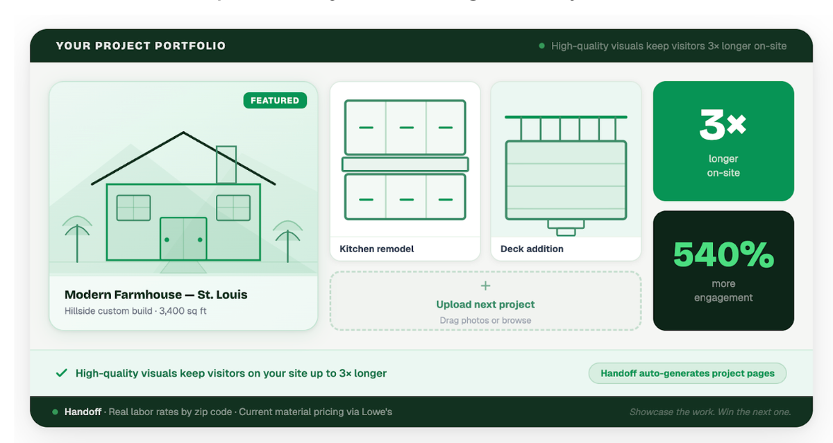 - Visual proof converts: High-quality project portfolios and before-and-after galleries keep visitors on your site up to 3x longer.