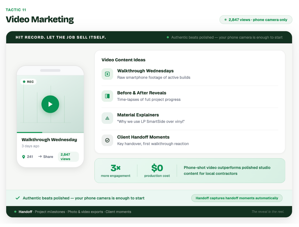 Example: A builder started filming raw, unedited "Walkthrough Wednesdays" on their smartphone. Every Wednesday, the owner walks through an active job site, explaining what the framing crew is doing or why they chose a specific type of insulation. These authentic, educational videos posted to Instagram Reels built massive trust with their audience, showing they have nothing to hide behind the drywall.