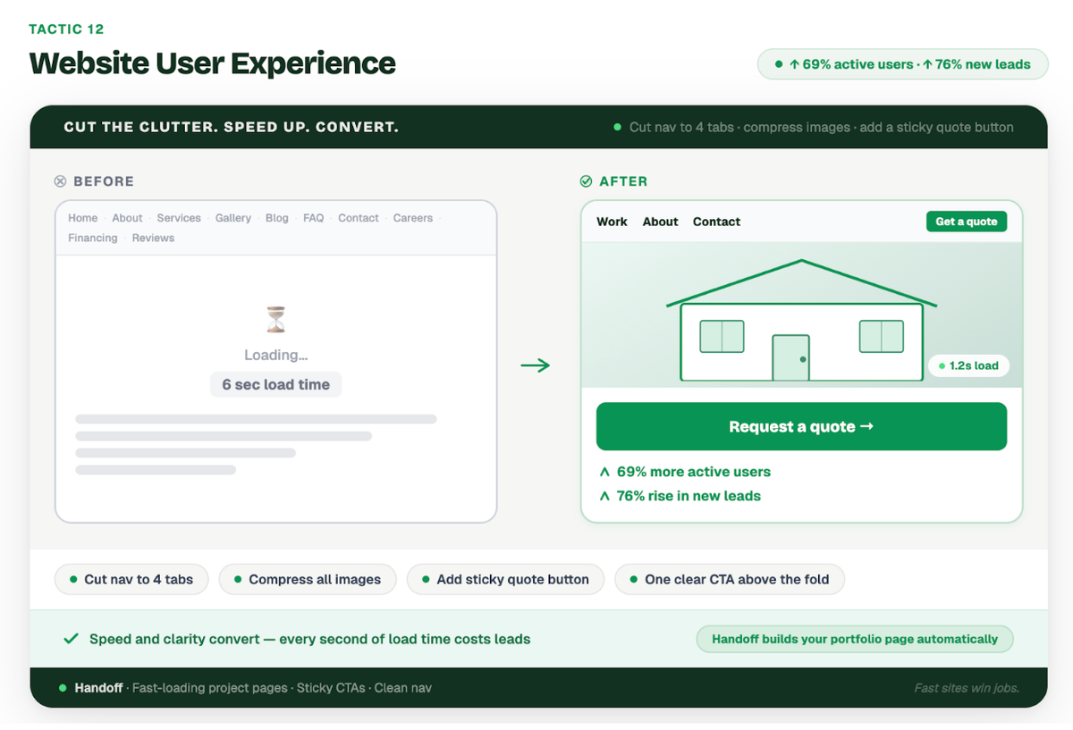 Example: A Naples luxury homebuilder realized their website was taking 6 seconds to load on mobile devices, causing users to bounce. They compressed their large portfolio images, streamlined their navigation menu from eight tabs down to four, and added a sticky "Request a Quote" button that stays visible as users scroll. This redesign resulted in a 69% increase in active users and a 76% rise in new leads.