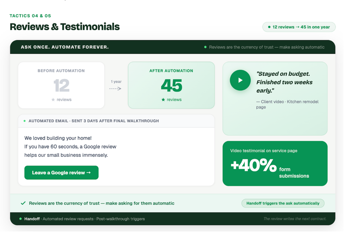Example: Instead of a generic "They did a great job" quote, a builder asked a past client to record a 30-second video on their phone standing in their new kitchen. The client specifically mentioned how the buil
