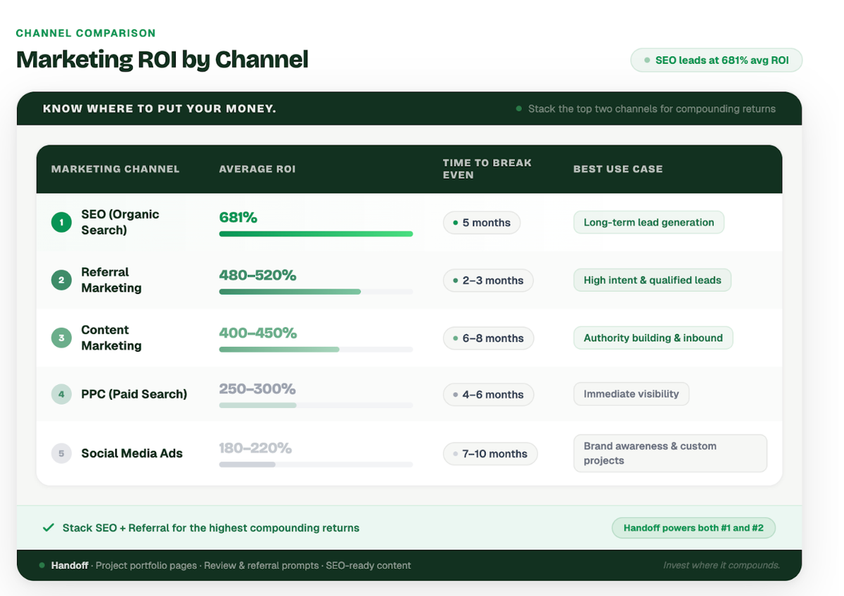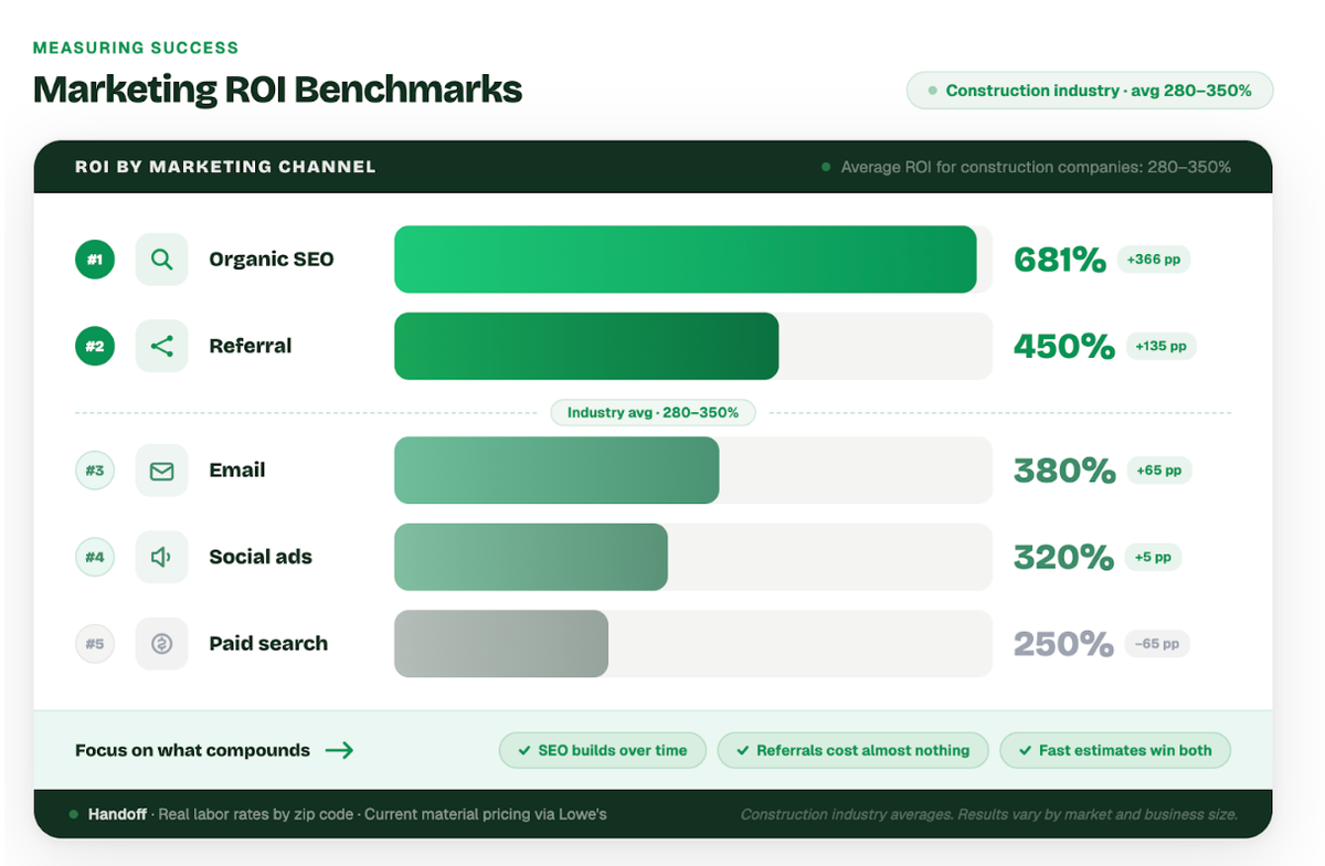 - ROI is measurable: The average marketing ROI for construction companies ranges between 280% and 350%, with organic SEO driving the highest long-term returns at 681%.