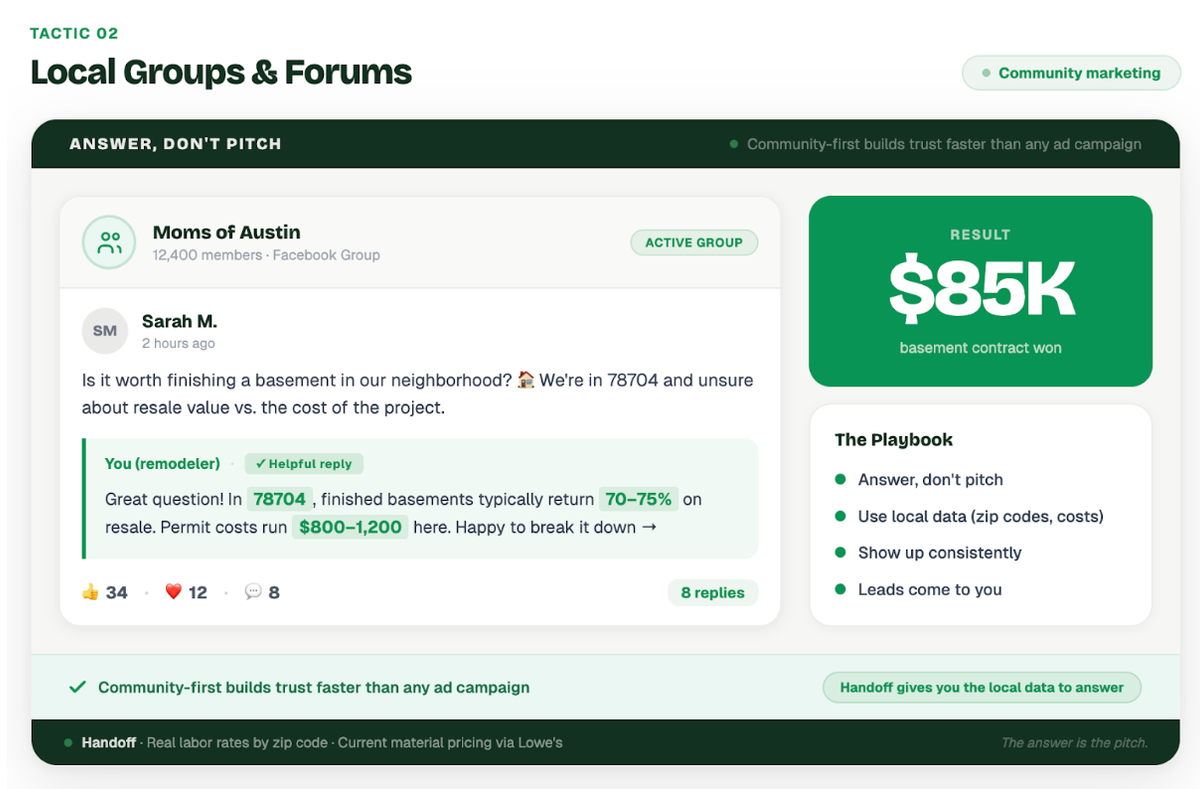 Example: A remodeler joined a local "Moms of Austin" Facebook group. Instead of pitching their services, they simply answered questions when homeowners asked for advice on permitting or material costs. When one member asked, "Is it worth finishing a basement in our neighborhood?", the remodeler provided a detailed breakdown of average ROI for that specific zip code. That helpful response led to a $85,000 basement finishing contract.