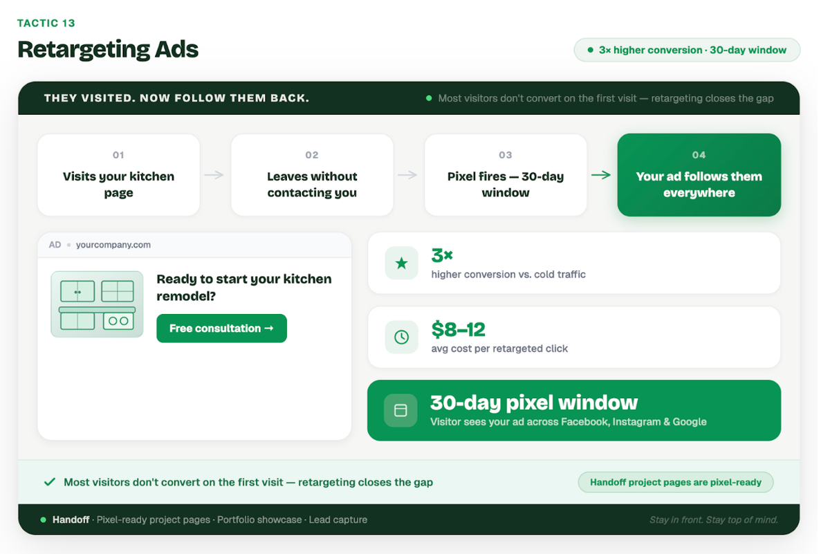 Example: A homeowner visits a builder's "Custom Kitchens" page but leaves without filling out a contact form. The builder uses Google Ads retargeting so that for the next 30 days, while that homeowner browses other websites or reads the news online, they see banner ads featuring the builder's best kitchen projects with the text, "Ready to start your kitchen remodel? Get a free consultation."