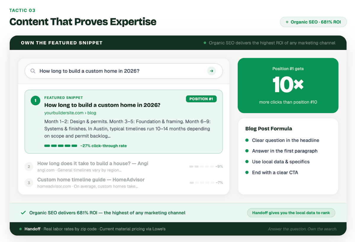 Example: A builder noticed clients constantly asking about the timeline for custom builds. They wrote a comprehensive blog post titled "How Long Does It Take to Build a Custom Home in 2026? A Month-by-Month Timeline." Because it directly answered a common question with clear, structured data, Google featured it as a snippet at the top of the search results, driving a steady stream of organic traffic to their site.