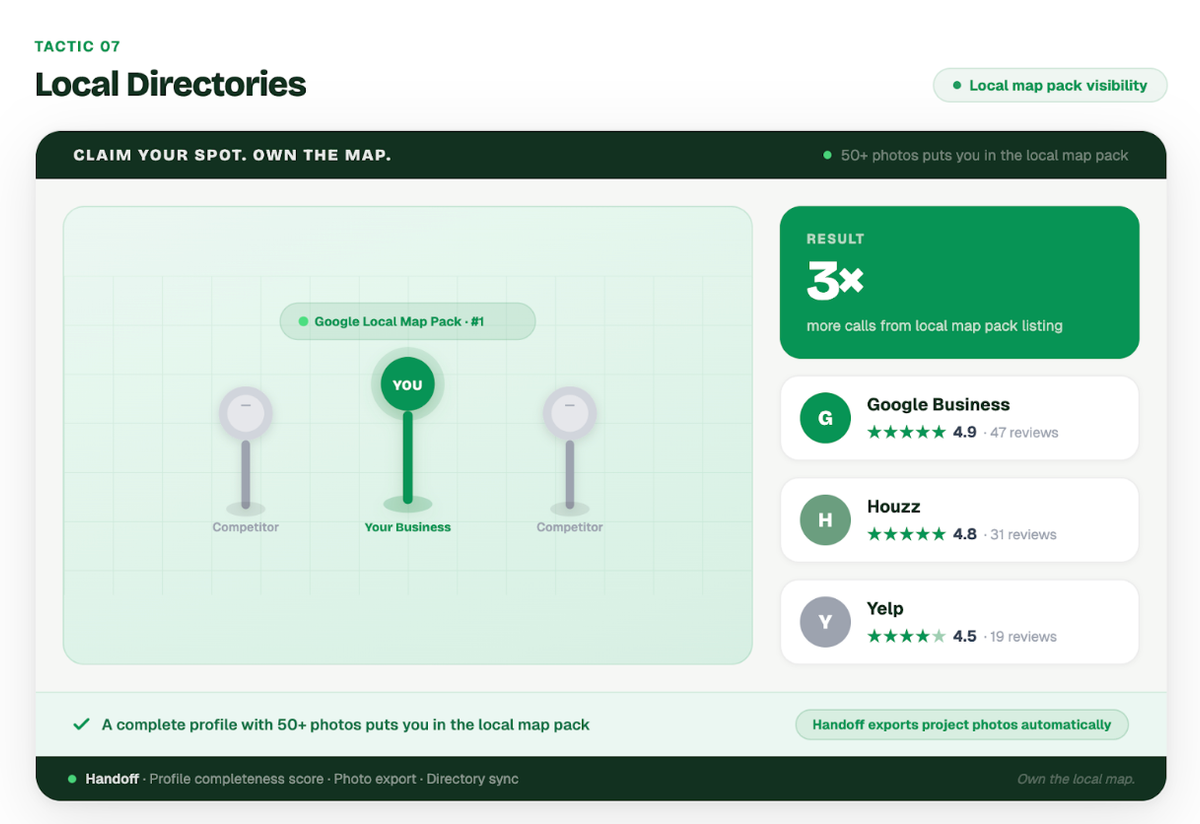Registering your business on online directories puts your name exactly where people are looking. Being easily found online increases inquiries and improves your local SEO footprint. Set up and optimize profiles on directories like Google Business Profile, Yelp, and Houzz, ensuring your information is accurate, up-to-date, and rich with project photos.