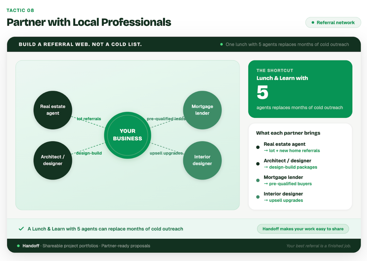 Example: A homebuilder hosted a "Lunch and Learn" event at their office, inviting five top-producing local real estate agents. The builder educated the agents on current construction costs per square foot and how to identify lots suitable for custom builds. In return for this valuable education, the agents began exclusively referring their clients who couldn't find existing inventory to this specific builder.
