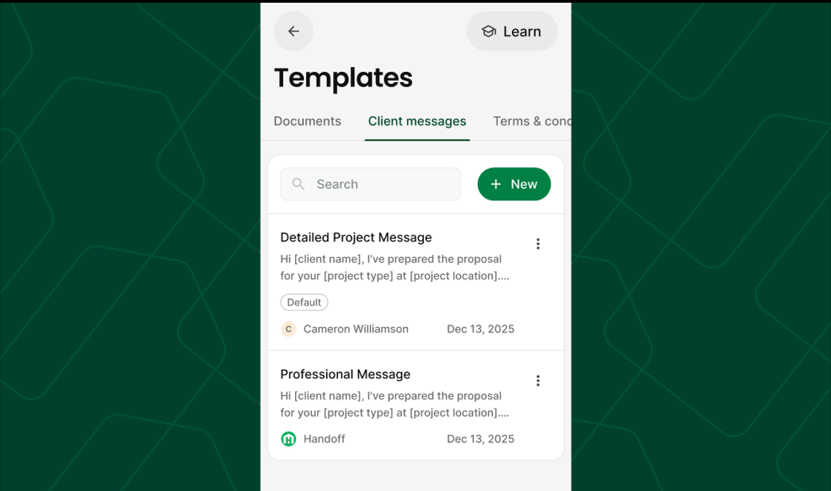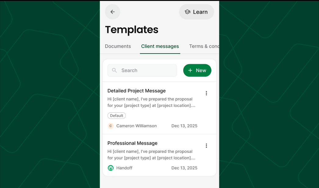 Don't have a template yet? Ask Handoff to draft one based on your preferences and save it. Next job, it's ready.